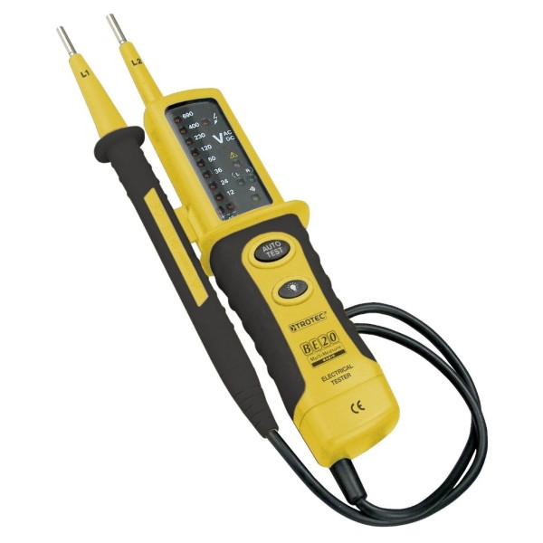 Професійний двополюсний індикатор напруги Trotec BE20 з візуальними та звуковими сигналами.