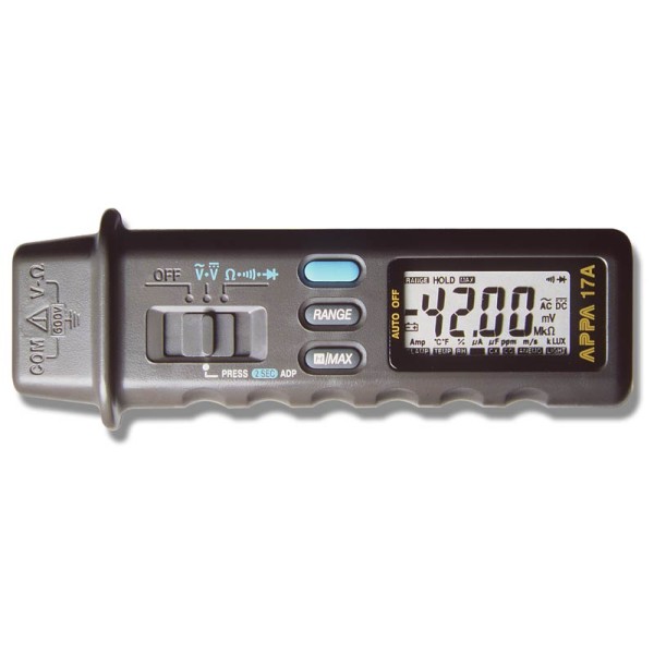 APPA 17A це мультиметр типу олівця: короткі тех. характеристики - постійна напруга 4,2 - 600 В; змінна напруга 4,2 - 600 В; опір 420 Ом – 42 МОм; цифрова (17-й лінійна) шкала; утримання свідчень; утримання max значень; адаптація до змінного перетворювача.