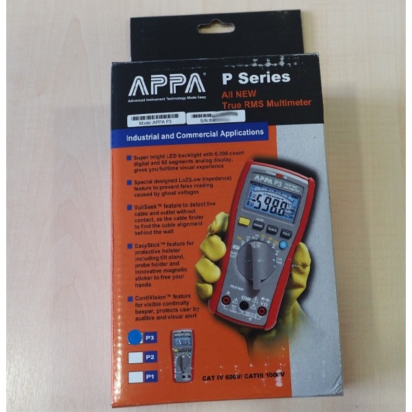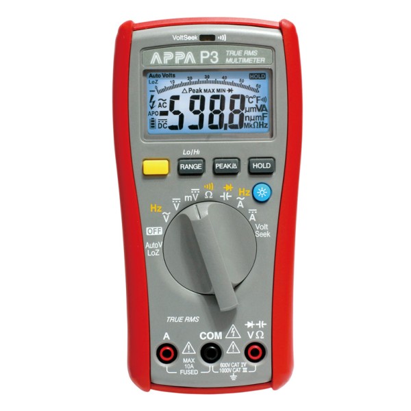 Мультиметр APPA P3 - компактний прилад, який використовується для налаштування електрообладнання та його діагностики. Дана модель дозволяє вибудувати схему вимірювання, швидко отримати показники струму високої точності і негайно виявити наявність напруги (діапазон 600 мВ ... 1000 В з похибкою всього ±0.5%) на провіднику або розетці (це допомагає зробити безконтактний сенсор VoltSeek). Має межу вимірювання струму – 10 А, а виміри опору до 40 Мом, частоти до 1000 кГц.