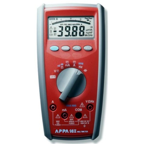 Мультиметры цифровые APPA 98II (APPA Technology Corporation): Краткие технические характеристики: Постоянное напряжение 400 мВ - 1000 В; Переменное напряжение 400 мВ - 750 В; Постоянный/переменный ток 40 мкА - 10 А; Сопротивление 400 Ом - 40 МОм; Частота 4 Гц - 40 МГц; Емкость 4 нФ - 40 мФ; Удержание показаний; Линейная шкала; Подсветка; Испытание p-n; Прозвон цепи; Частота вращения; Измерение среднеквадратичного значения сигнала произвольной формы True RMS.