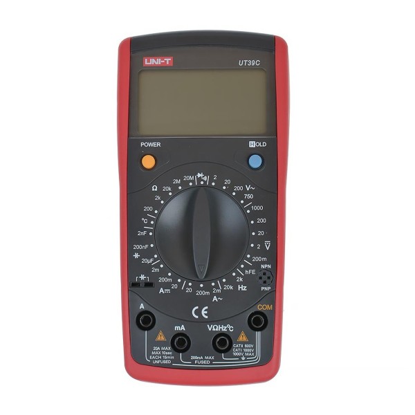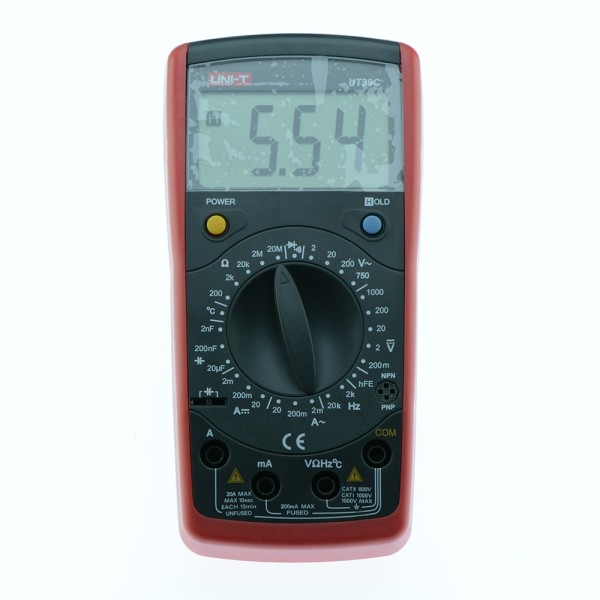 Цифровой мультиметр UT39C от известного производителя Uni-Trend измеряет постоянный и переменный ток, постоянное и переменное напряжение, сопротивление, емкость, частоту, температуру, а также используется для прозвонки цепи, тестирования диодов и транзисторов.