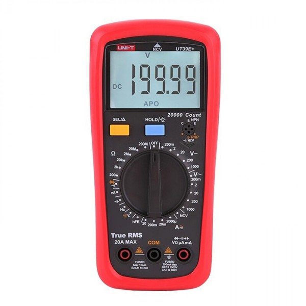 Цифровой мультиметр UT39E+ измеряет постоянный и переменный ток, постоянное и переменное напряжение, сопротивление, емкость, частоту, а также используется для прозвонки цепи, тестирования диодов и транзисторов.