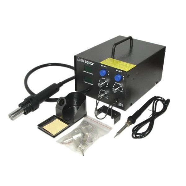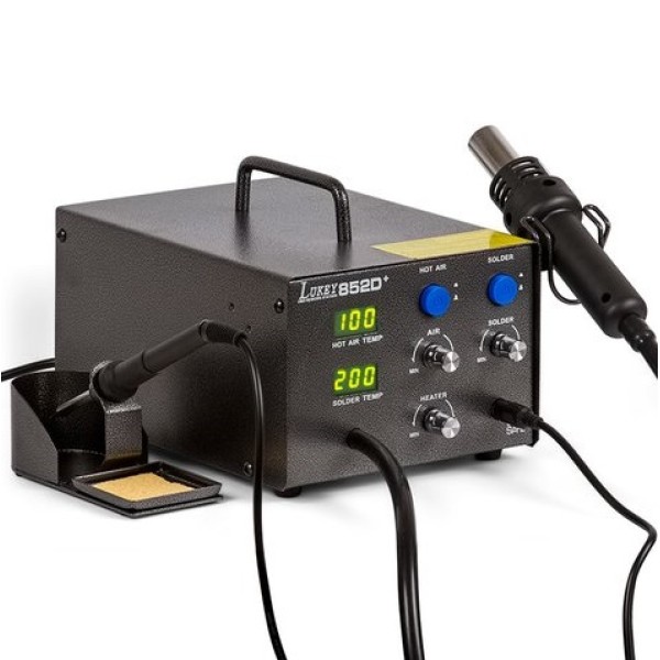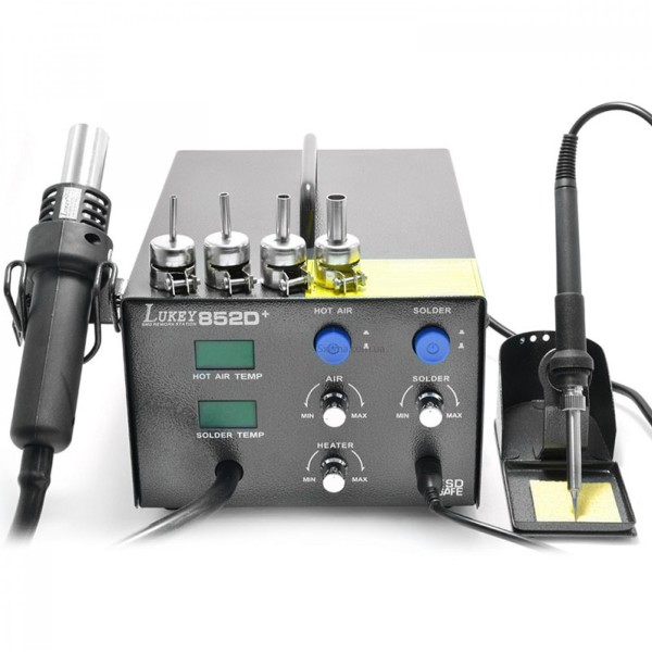 Паяльная станция Lukey 852D+ является востребованным оборудованием в частных мастерских и сервисных центрах по ремонту радиоэлектроники и аппаратуры. Аппарат отличается высокой мощностью и функциональностью. Цифровая информация предоставляется двумя дисплеями. Здесь показаны текущие значения температур паяльника и термофена. Настойка показателей проводится при помощи независимых регуляторов. В качество рабочих компонентов используются такие, как SOP, QFP, CHIP, SMD и другими.