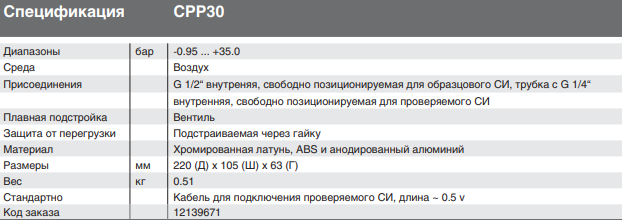 Несмотря на небольшие габаритные размеры пневматический насос CPP30 легок в работе и создании необходимого давления; переключатель “вакуум/избыточное давление” также позволяет создавать разрежение. Насос имеет вентиль плавной подстройки. Образцовое средство измерения давления устанавливается на насос, а проверямое средство измерения через переходник с резьбой 1/4” внутренняя резьба, который входит в комплект поставки.